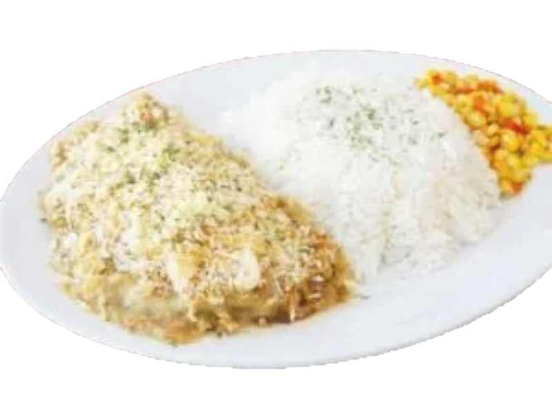 A generous serving of succulent white fish baked in cream sauce with a hint of mustard on a bed of herbed scalloped potatoes, crowned with mozarella crumb topping; served with garlic rice and corn relish, good for 1-2
