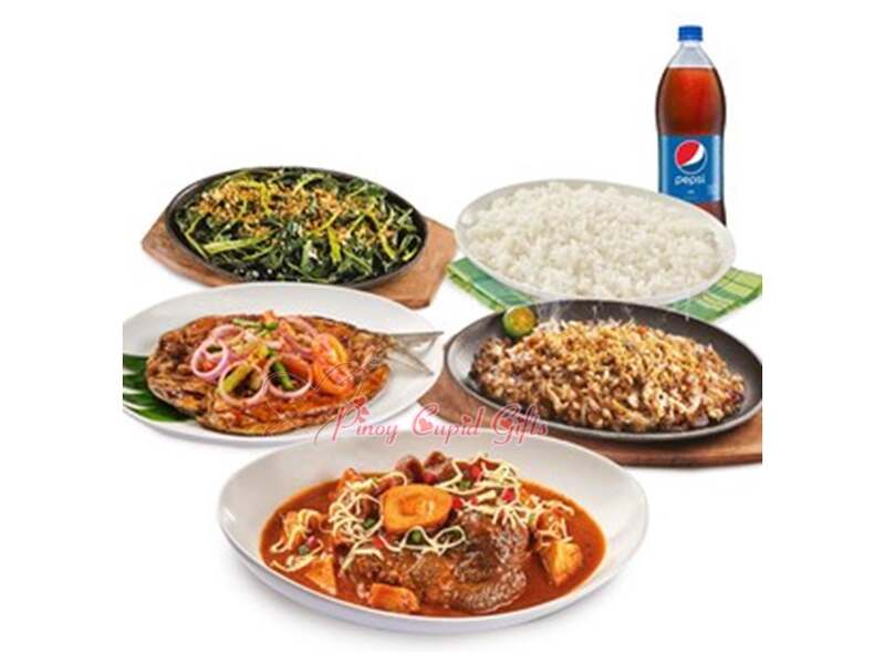 Prime Beef Kaldereta Sizzling Sisig Sizzling Kangkong ala Pobre Bangus ala Pobre (5) Plain Rice Pepsi 1.5L Good For 2-3 persons