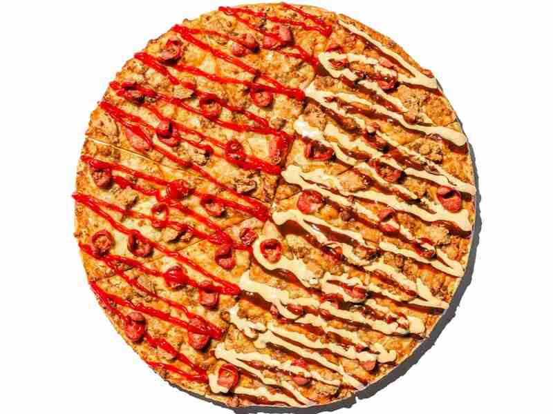 A 2in1 Original Pizza topped with chicken poppers, sausages, and ground beef on a bed of Yellow Cab’s signature pizza sauce and real mozzarella cheese, drizzled with ketchup, and cheese & BBQ sauce.