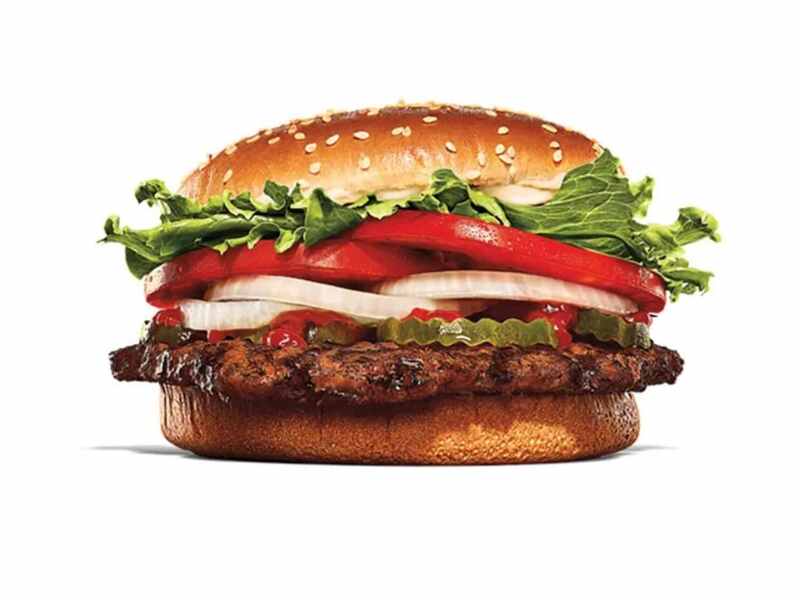 100% flame-grilled beef topped with juicy tomatoes, fresh lettuce, creamy mayonnaise, ketchup, crunchy pickles, and sliced white onions on a soft sesame seed bun.